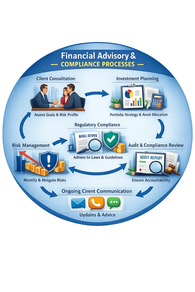 Financial Advisory & Compliance helps businesses and individuals manage finances effectively while staying legally compliant. It includes expert guidance on financial planning, tax optimization, and risk management. Compliance ensures timely filings, accurate records, and adherence to all regulations to avoid penalties and legal issues.